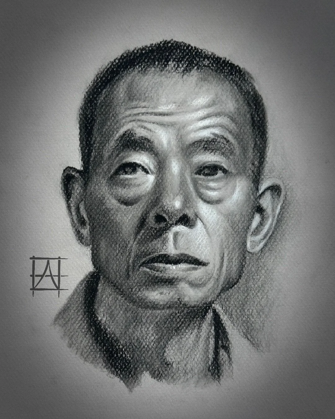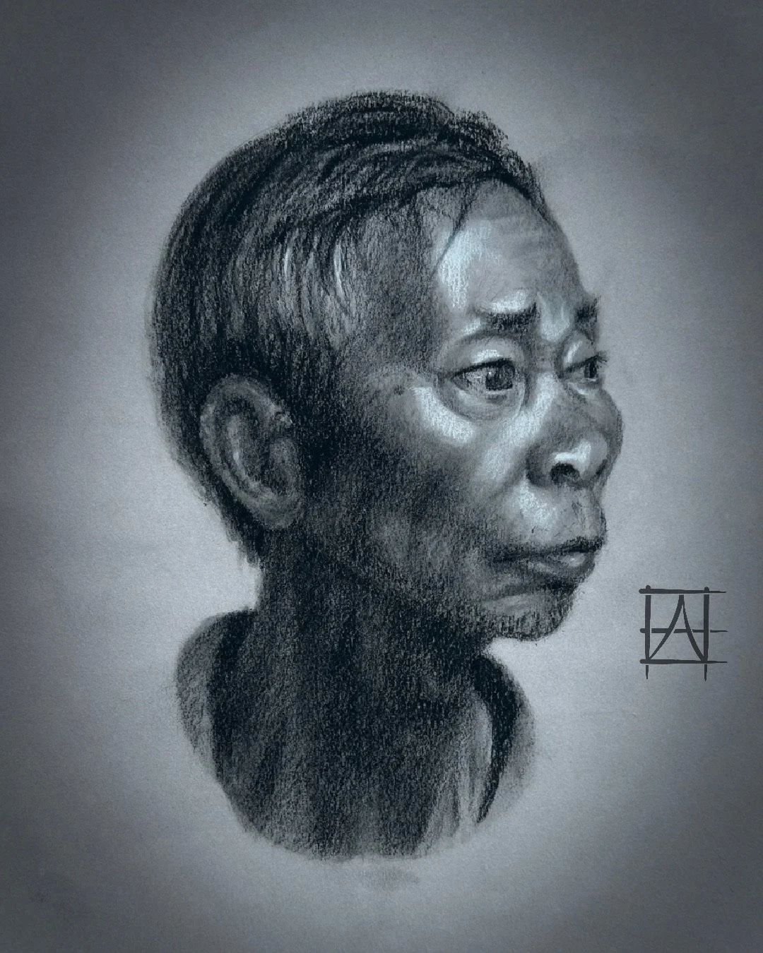 A detailed black and white pencil portrait of an elderly Asian woman with short hair, looking to the right. Custom black and grey realism tattoo done in Louisville, KY. Custom black and grey realism tattoo done in Louisville, KY.