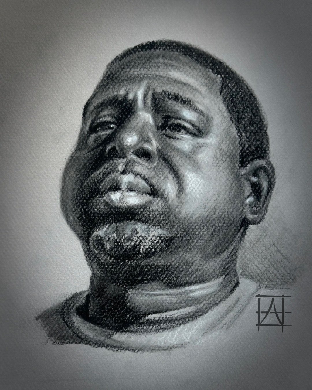 Black and white detailed pencil sketch of a man with short hair, expressive eyebrows, and slightly open mouth, wearing a collared shirt. Custom black and grey realism tattoo done in Louisville, KY.